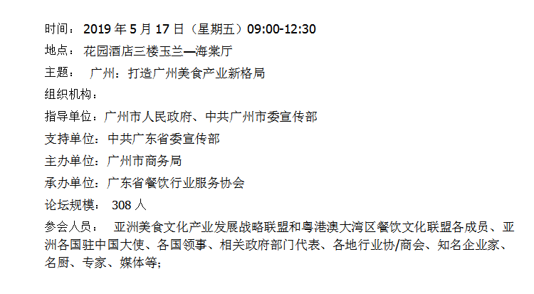 广东省餐饮服务行业协会受市委市政府委托承接本届广州亚洲美食节中分论坛二“美食与产业发展”具体工作。