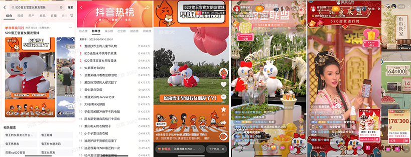 今年,在520节庆氛围下,蜜雪冰城以其IP雪王雪妹婚庆为主题,结合品牌年轻调性和迎合Z世代受众人群,进行直播间和短视频内容打造,话题#520雪王官宣女朋友雪妹 相关短视频播放量超6000万。