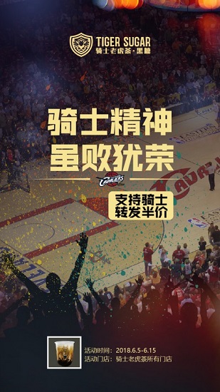 继赢一场请喝“免费茶”后,骑士老虎茶又推出了“支持骑士,转发半价”的活动,再一次强调“骑士精神,虽败犹荣”!即日起至6月15日,消费者转发骑士老虎茶本活动的信息至朋友圈或微信群,到店出示截图,即可享受骑士老虎茶所有饮品半价优惠。