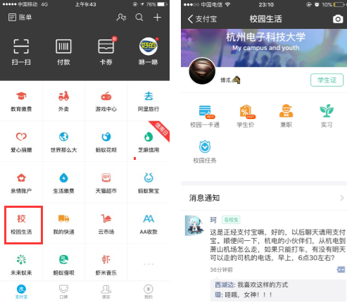 从移动支付走向全景式的场景平台,支付宝衔枚疾进。6月1日,支付宝对外宣布,原先聚焦高校学生群体的校园一卡通充值功能,正式全面升级为集学生福利,兼职信息,校园活动等的综合校园社区平台。